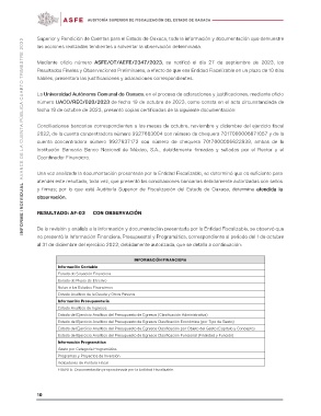 INFORME INDIVIDUAL AVANCE DE LA CUENTA PÚBLICA CUARTO TRIMESTRE 2022 Superior y Rendición de Cuentas para el Estado de Oaxaca, toda la información y documentación que demuestre