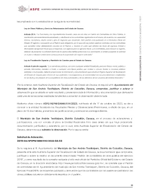 Por lo anterior, esta Auditoría Superior de Fiscalización del Estado de Oaxaca, le requirió al H. Ayuntamiento del