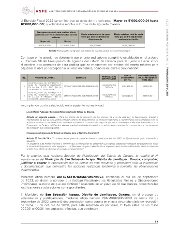 Con base en lo anterior se determinó que el ente auditado no cumplió lo establecido en el artículo INFORME INDIVIDUAL CUENTA PÚBLICA MUNICIPAL 2022