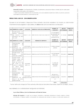 Derivado de la Verificación e Inspección Física realizada a las obras incluidas en la muestra, se determinaron