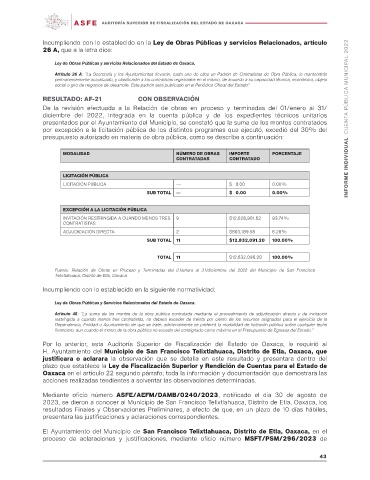 Artículo 46: “La suma de los montos de la obra pública contratada mediante el procedimiento de adjudicación directa y de invitación