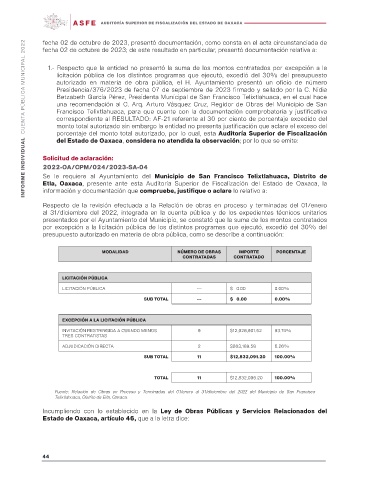 1.- Respecto que la entidad no presentó la suma de los montos contratados por excepción a la