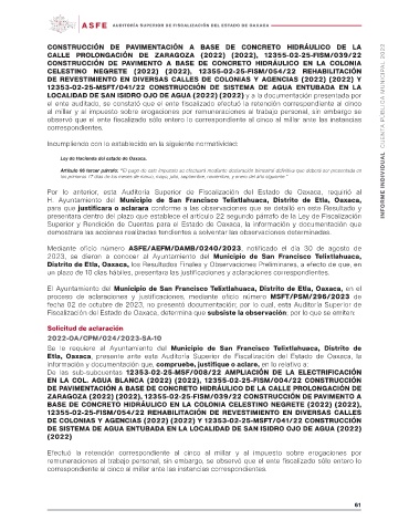 Fiscalización del Estado de Oaxaca, determina que subsiste la observación; por lo que se emiten: