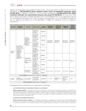 INFORME INDIVIDUAL CUENTA PÚBLICA MUNICIPAL 2022 registró los Programas Presupuestarios denominados: “Desarrollo Social y Humano”, con un importe