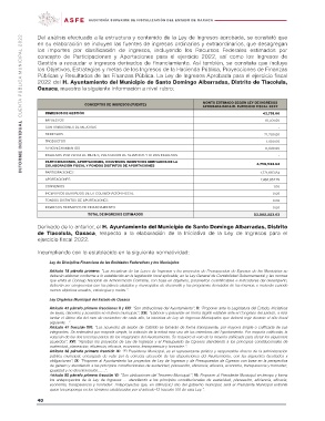 INFORME INDIVIDUAL CUENTA PÚBLICA MUNICIPAL 2022 Del análisis efectuado a la estructura y contenido de la Ley de Ingresos aprobada, se constató que