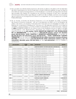 INFORME INDIVIDUAL CUENTA PÚBLICA MUNICIPAL 2022 d) De la revisión al contenido de los inventarios de bienes muebles e inmuebles al 31 de diciembre