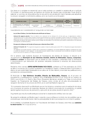 INFORME INDIVIDUAL CUENTA PÚBLICA MUNICIPAL 2022 Con base en lo anterior se determinó que el ente auditado no cumplió lo establecido en el artículo