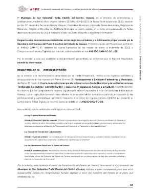 participaciones y aportaciones; así mismo respecto a la póliza de Ingreso número 000052 no presentó el