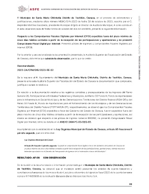 De la revisión a la documentación e información presentada por el Municipio de Santa María Chilchotla, Distrito