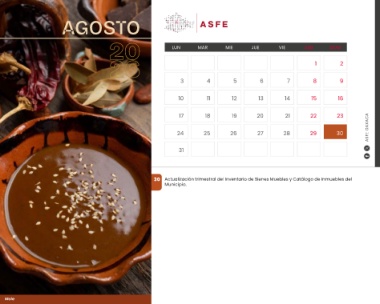 AGOSTO LUN MAR MIE JUE VIE SAB DOM 34 5 6 7 1 2 10 11 12 13 14 17 18 19 20 21 89 24 25 26 27 28 31 15 16 22 23 ASFE OAXACA 29 30 30 Actualización trimestral del Inventario de Bienes Muebles y Catálogo de Inmuebles del Municipio. Mole
