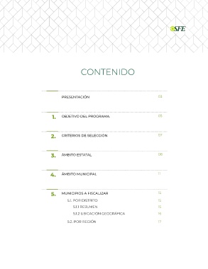 CONTENIDO 03 PRESENTACIÓN 05 1. OBJETIVO DEL PROGRAMA. 07 2. CRITERIOS DE SELECCIÓN 08 3. ÁMBITO ESTATAL 11 4. ÁMBITO MUNICIPAL 15 15 5. MUNICIPIOS A FISCALIZAR 15 16 5.1. POR DISTRITO 17 5.1.1 RESUMEN 5.1.2 UBICACIÓN GEOGRÁFICA 5.2. POR REGIÓN